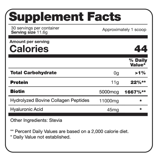 Biotin. Low molecular weight, hydrolized, type I and III Collagen Peptides. Hyaluronic Acid, Stevia.